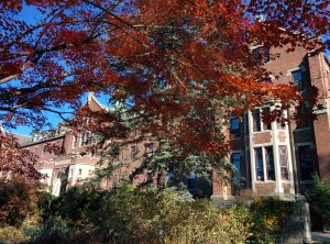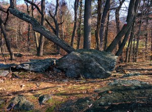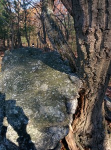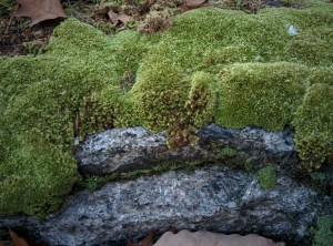During the retreat, part of my free time was spent reading The Human Phenomenon where Teilhard invites us to see the earth as having undergone three major stages of development since its birth as a planet, stages that can be described as three concentric spheres, the geosphere, biosphere, and noosphere (cf. the preceding post). Because of the evocative power of the book’s vision and the retreat’s contemplative focus on God’s love in an evolving universe, my outdoor walks during this time became meditations on particular aspects of the monastery grounds: the remarkable outcroppings of stone; the deep green of moss amidst the autumn colors of shrubs, trees, and fallen leaves; the evidence everywhere of human activity including the monastery and its current inhabitants, but also artifacts and symbols from different religious traditions to be found within and outside the building. In other words, I was learning to see the many aspects of my surroundings as parts of the whole of what Berry calls the Earth community.